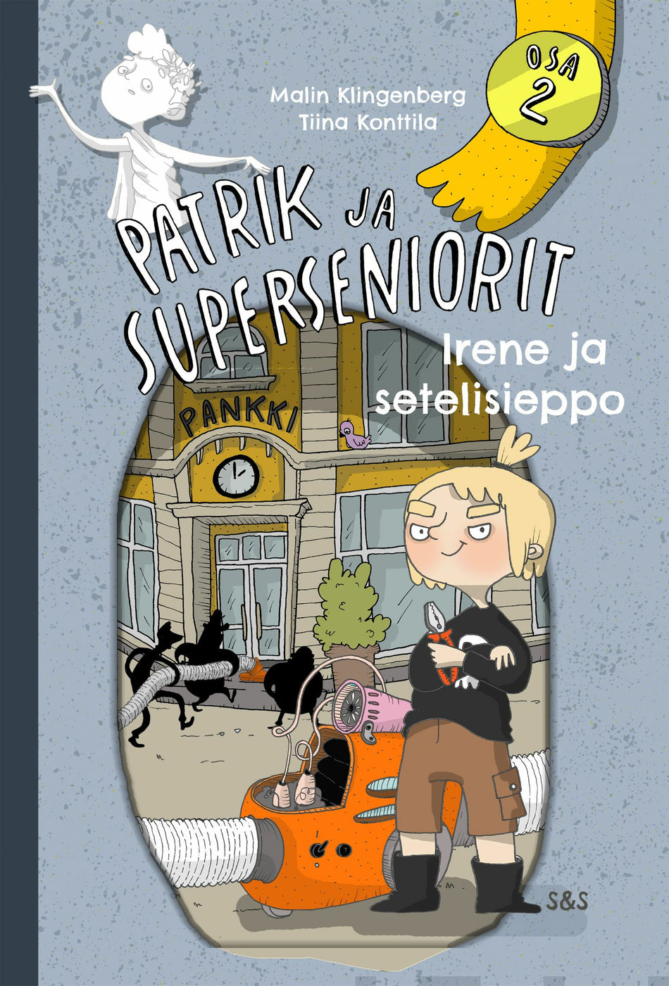 Irenen isä, Haba-Tero on pulassa ryövärijoukkoineen. He eivät ole aikoihin onnistuneet rötöksissään, ja nyt rikollisjengin pomo, Vihtori Tyr uhkaa heitä erottamisella.Haba-Tero päättää tehdä elämänsä suurimman rötöksen. Tietämättään rikoskopla saa apua Ireneltä, joka on salaa rakentanut setelisiepon. Sillä voi näet imuroida pankin kassaholvista setelit ja kolikot parempaan talteen. Roistot ovat kuitenkin unohtaneet yhden asian: Patrikin ja superseniorit.Malin Klingenberg on suomenruotsalainen kirjailija, joka on palkittu Runeberg Junior -palkinnolla. Irene ja setelisieppo on hilpeän Patrik ja superseniorit -sarjan toinen osa.