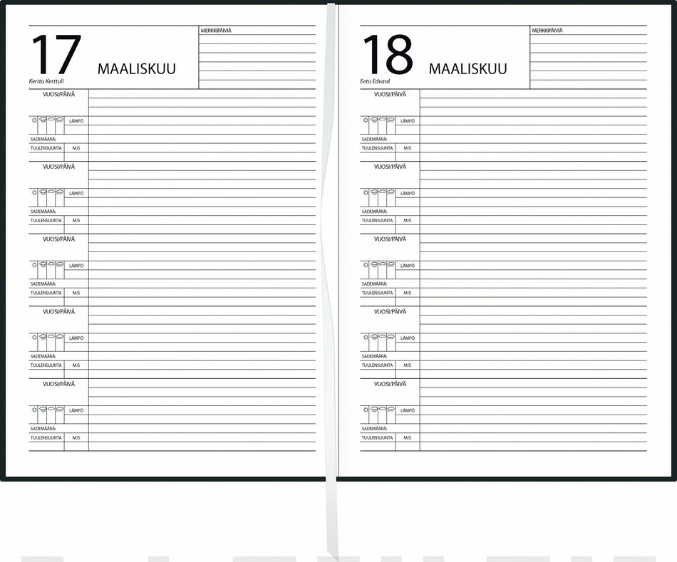5 vuotta muistiin, aloita koska vain. Koko 148 x 210 mm (A5); sidottu; päiväämätön; yksi päivä viideksi seuraavaksi vuodeksi; merkitse itse vuosiluku ja viikonpäivä; suomalaiset nimipäivät; runsaasti muistiinpanotilaa. Lue lisää