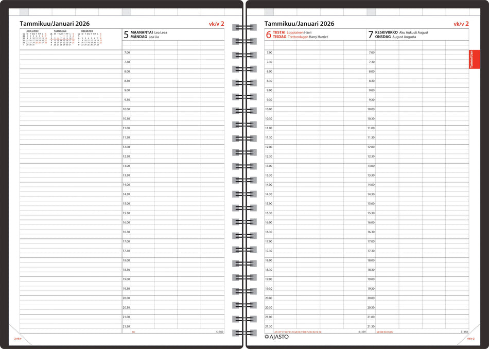 Koko 210 x 297 mm (A4); kielisyys: suomi, ruotsi; parikierresidottu, viikko kahdella aukeamalla; vuosisuunnitelmat 2026 ja 2027, kalenteritaulukot vuosille 2027–2032; suomalaiset ja suomenruotsalaiset nimipäivät; takana esiintaitettava vuoden 2026 taulukkokalenteri; Suomen kartta; FSC®-sertifioit... Lue lisää