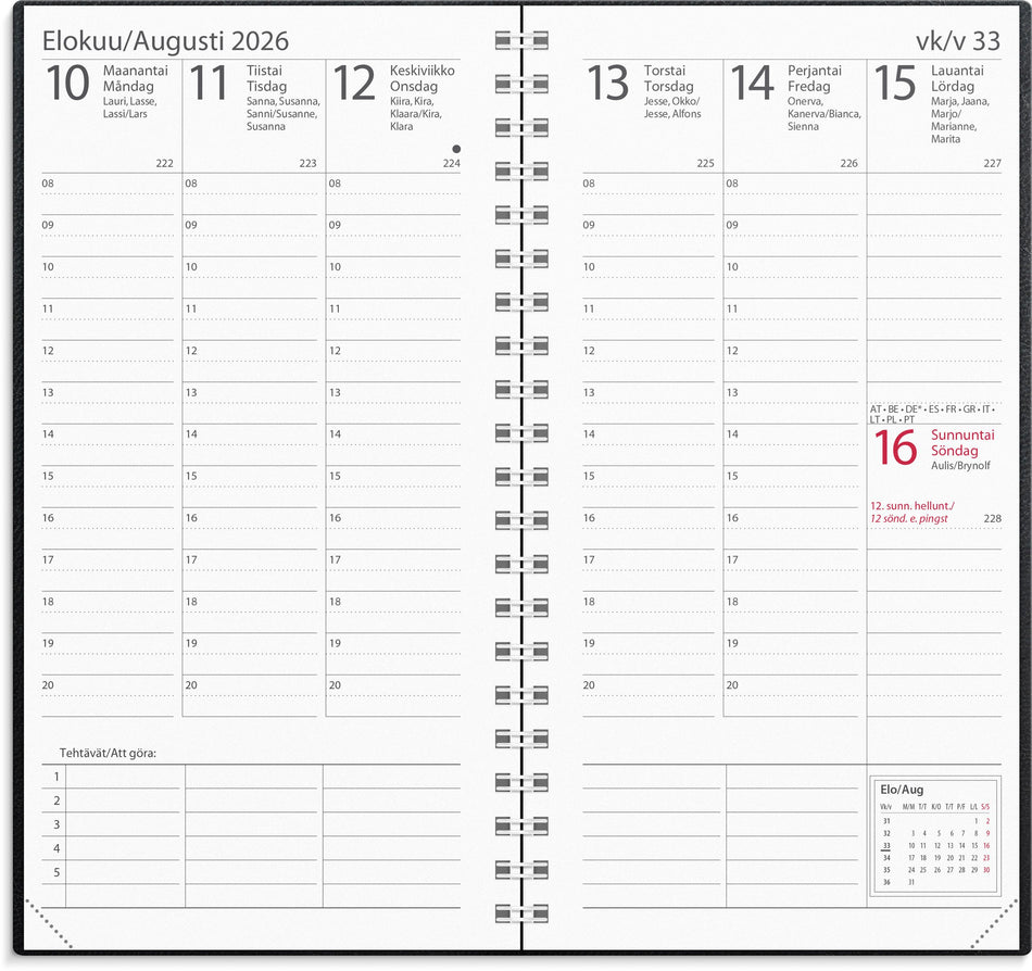 Kalenterin aukeamalla yksi viikko ja kuluvan kuukauden kalenteritaulukko, tuntijaotus 08-20. Kalenteri sisältää nimipäivät, kansalliset pyhäpäivät, liputuspäivät, kuun vaiheet, vuosisuunnitelmat kuluvalle ja seuraavalle vuodelle, vuosiruudukot kuluvalle ja seuraavalle vuodelle, yleiset pyhäpäivät... Lue lisää
