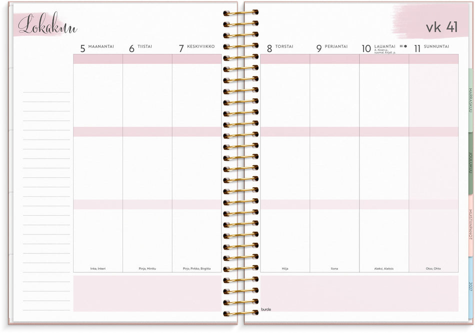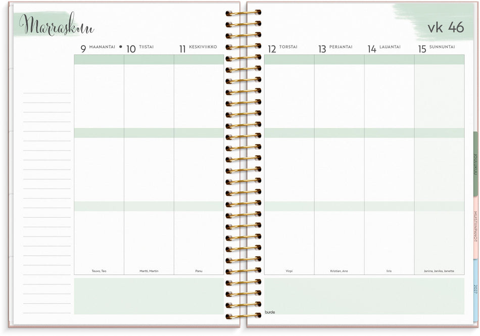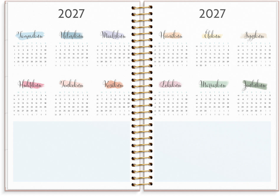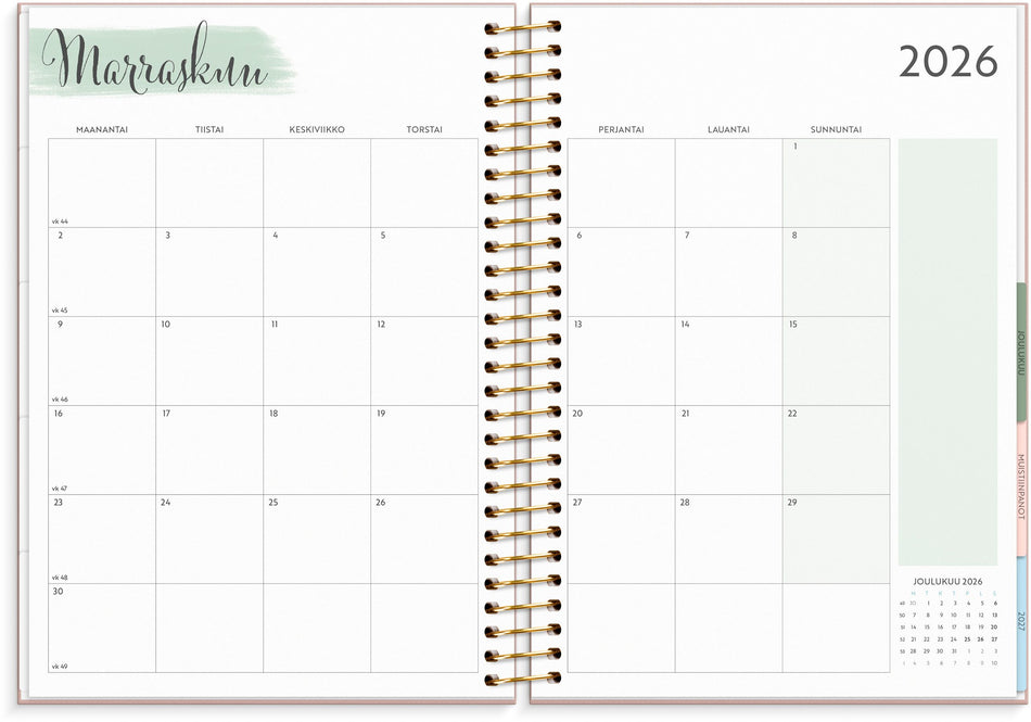 Tämä on kalenteri hänelle, joka haluaa järjestystä ja siisteyttä fiksulla ja tyylikkäällä tavalla. Kuukausilovituksen avulla löydät kuukaudet helposti. Kalenteriosan jälkeen löytyy runsaasti tilaa muistiinpanoille ja suunnittelulle. Kalenterin takaosasta löytyy tarra-arkkia sekä säilytystasku kuiteille tai irtosivuille. Kartonkikannet painatuksella. Kalenteri sisältää nimipäivät, juhlapyhät, liputuspäivät, kuun vaiheet, vuosiruudukot kuluvalle ja tulevalle vuodelle, vuosisuunnitelman kuluvalle vuodelle ja muistiinpanosivuja. Kalenteriosa: vk 1 2026-vk 53 2026/2027. Suomenkielinen. Kierresidottu. FSC®. Koko: 163x229 mm.