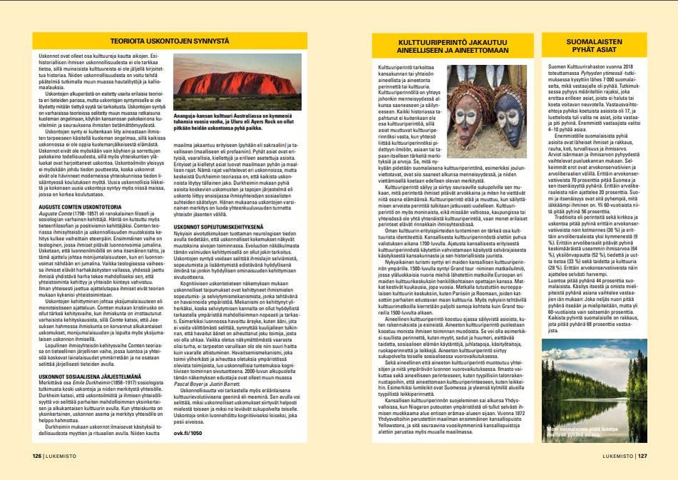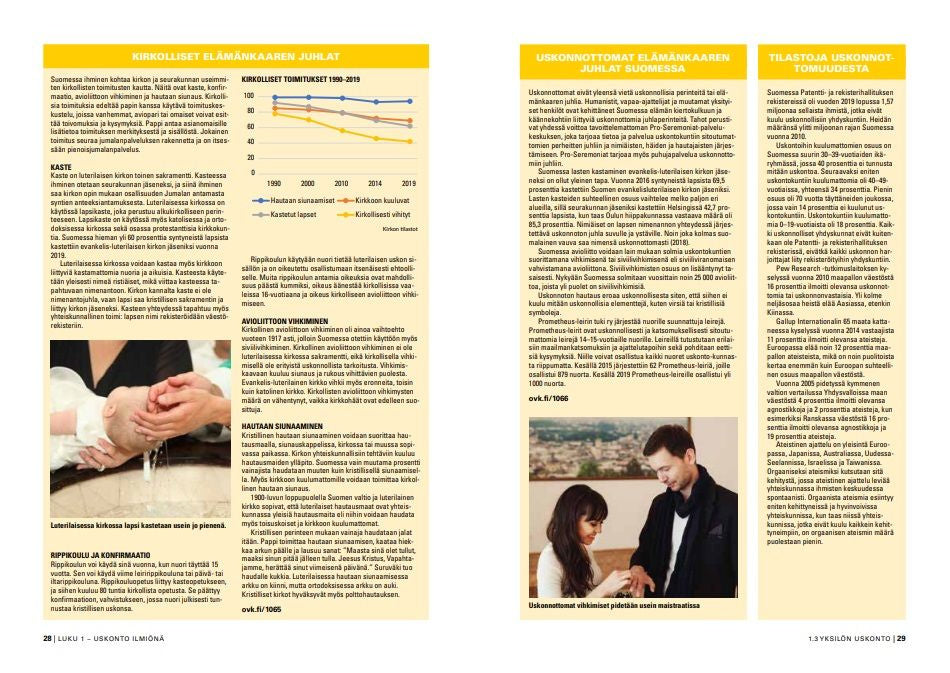 Kirjan luvuissa on esitetty keskeinen aines päätekstissä ja syventävä aines värillisellä pohjalla olevissa lisäteksteissä. Kirjan lopussa on lisäksi laaja lukemisto. Lukemisto laajentaa uskonnon ensimmäisen kurssin sisältöjä olennaisella ja oivaltavalla tavalla. Tämä tarjoaa kiinnostavia lukuhetkiä niille, jotka opiskelevat vain uskonnon pakolliset kurssit. Lisäksi lukemisto tarjoaa uskonnon ylioppilaskirjoituksissa kirjoittaville mahdollisuuden tavoitella korkeinta arvosanaa.