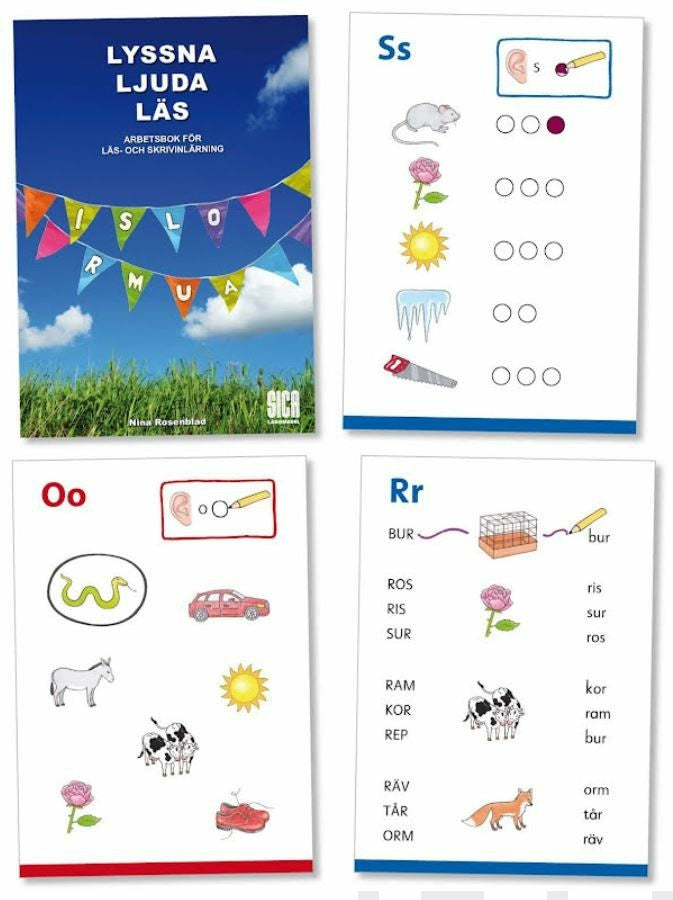 Den första boken i serien Lyssna Ljuda Läs med sex sidor var av bokstäverna i, s, l, o, r, m, u och a.