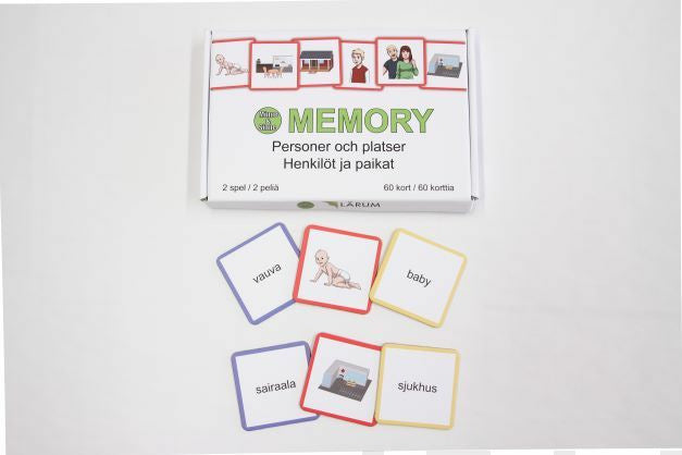 Den här lådan innehåller två memoryspel. Ett spel innehåller tio ord. Varje ord finns på tre brickor: en svensk, en finsk och en bildbricka. (2*10*3 = 60 brickor). Plocka ut kort som passar spelarna. Variera svårighetsgraden med innehåll och antal brickor. Spela med ord och bild, bara ord, ett sp... Lue lisää