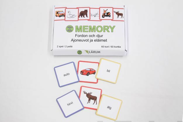 Den här lådan innehåller två memoryspel. Ett spel innehåller tio ord. Varje ord finns på tre brickor en svensk, en finsk och en bildbricka. (2*10*3=60 brickor) Plocka ut kort som passar spelarna. Variera svårighetsgraden med innehåll och antal brickor. Spela med ord och bild, bara ord, ett språk,... Lue lisää