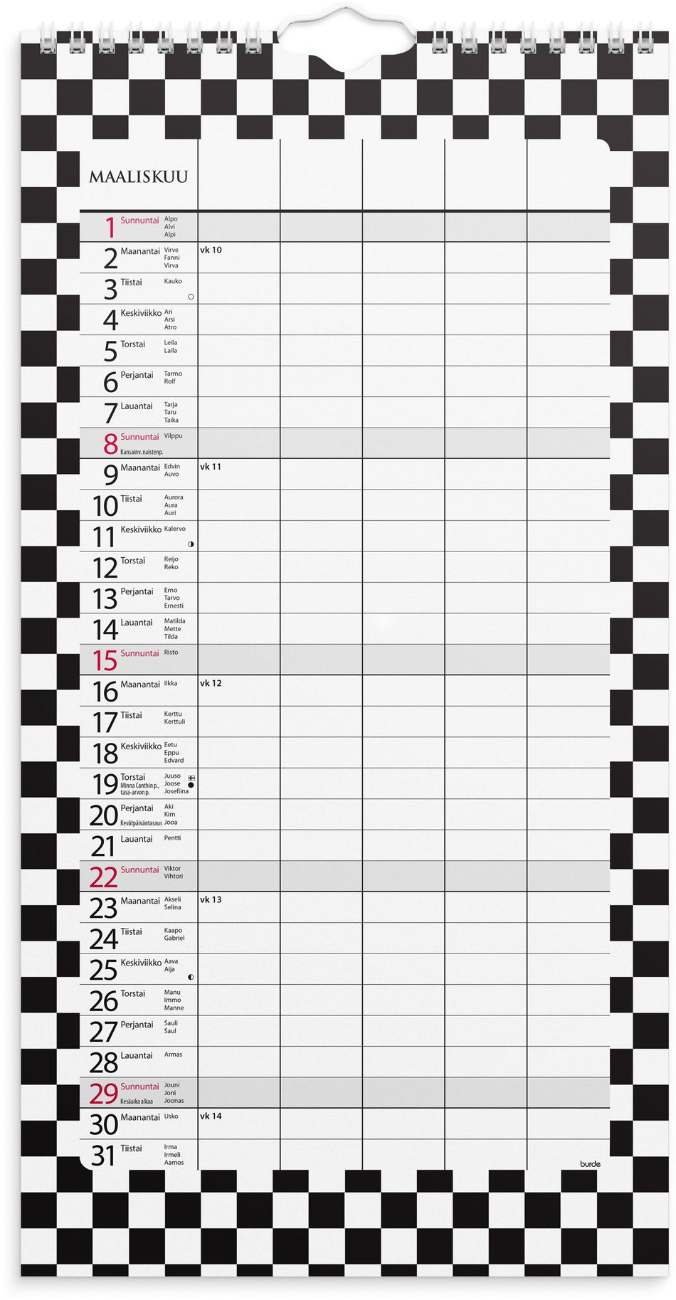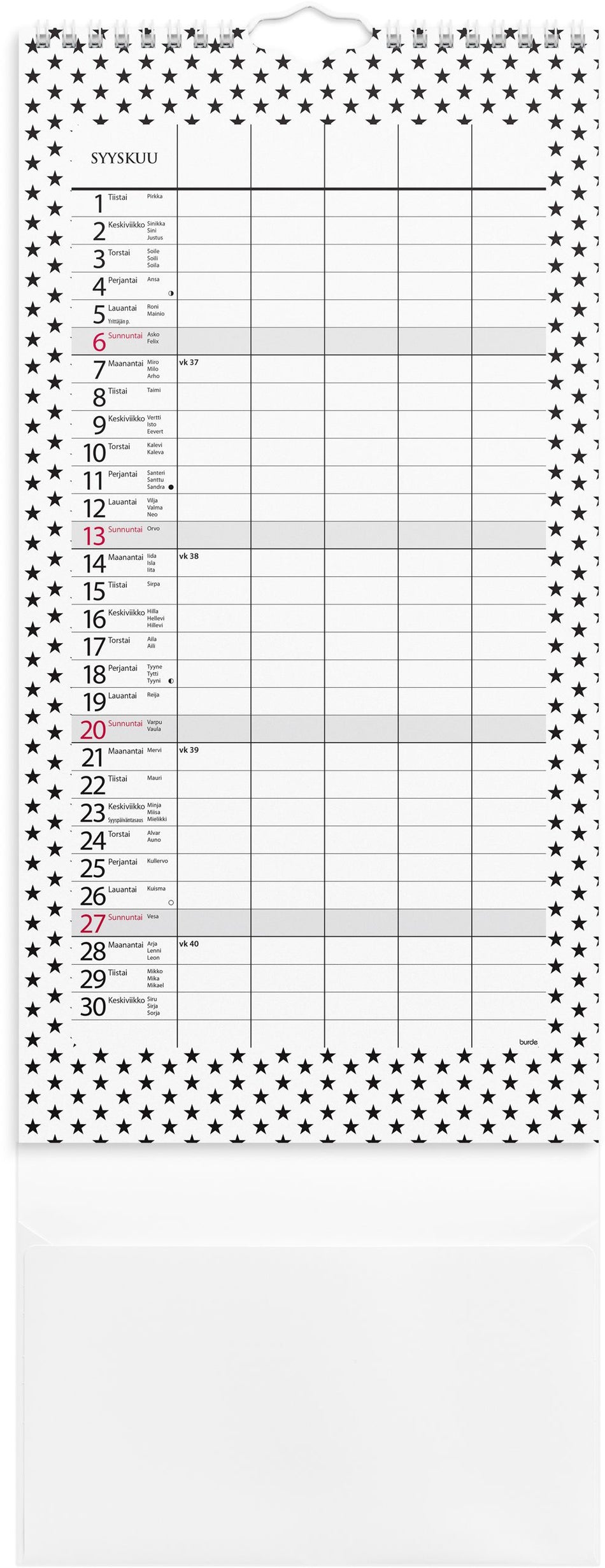 12 sivua. Moderni suunnitelmakalenteri viidellä sarakkeella. Kätevä paperitasku tärkeille papereille.. Kalenteri sisältää nimipäivät, liputuspäivät, kansalliset pyhäpäivät ja kuun vaiheet. Suomenkielinen. Parikierresidottu. FSC®. Koko: 220x430 mm (ilman paperitaskua). Lue lisää