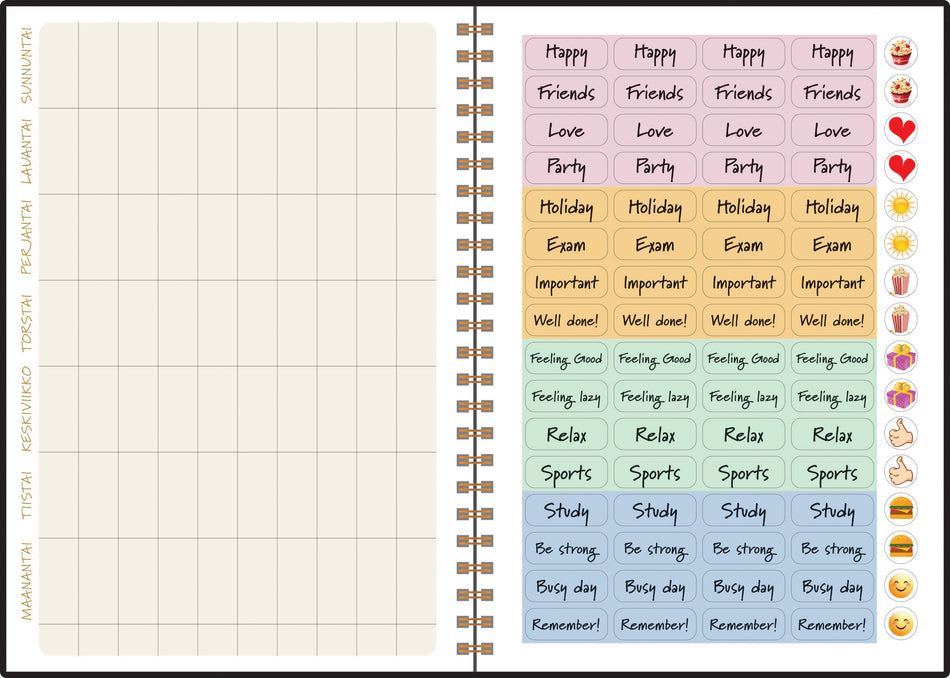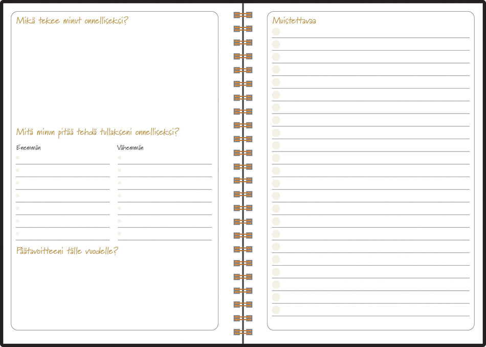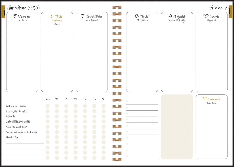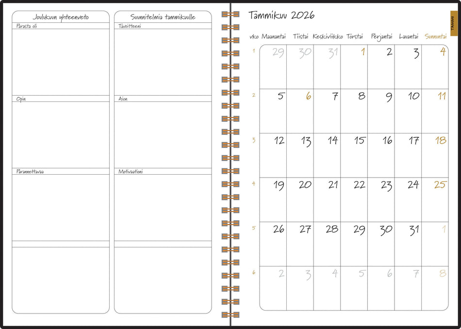 Koko 148 x 210 mm (A5); parikierresidottu; tukevat kartonkikannet; hyvinvointiin kannustava selkeä viikkonäkymä; päiväkirja 52/2025 - 1/2027; vuosisuunnitelmat 2026 ja 2027; joka kuukauden alussa kuukausisuunnitelma-aukeama; liputuspäivät Suomessa; suomenkieliset nimipäivät; budjettiseurantasivuj... Lue lisää