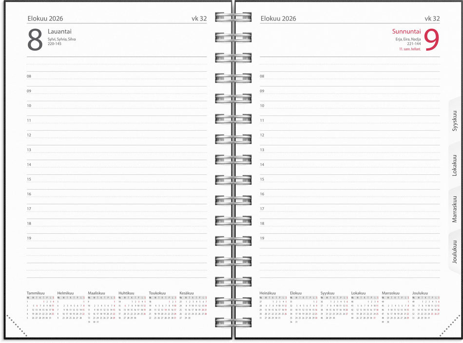 Pellavatekstiilikansi. Kalenterin aukeamalla kaksi päivää, tuntijaotus 08-19, reilusti muistiinpanotilaa ja koko vuoden kuukausitaulukot. Kalenteri sisältää nimipäivät, kansalliset pyhäpäivät, liputuspäivät, vuosisuunnitelmat kuluvalle ja seuraavalle vuodelle, kalendaariset tiedot, auringon nousu... Lue lisää