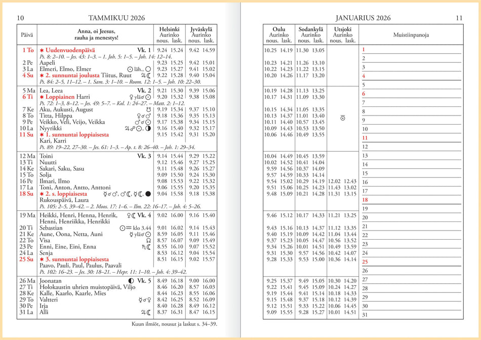 Koko 210 x 297 mm (A4); stiftattu; 80 sivua; yksi kuukausi aukeamalla; aakkosellinen nimipäiväluettelo; auringon ja kuun nousu- ja laskuajat monella paikkakunnalla; muita tähtitieteellisiä tietoja; säätaulukoita; kirkolliset juhlapäivät sekä markkina- ja toripäivät; ajankohtainen artikkeli; kelta... Lue lisää