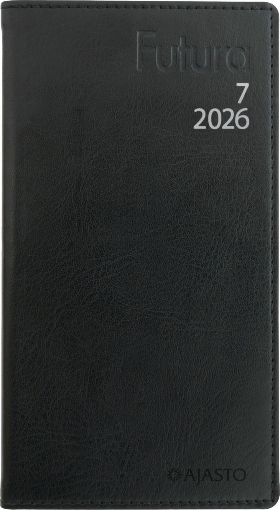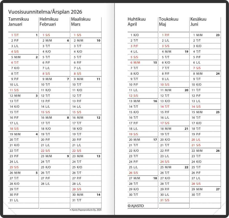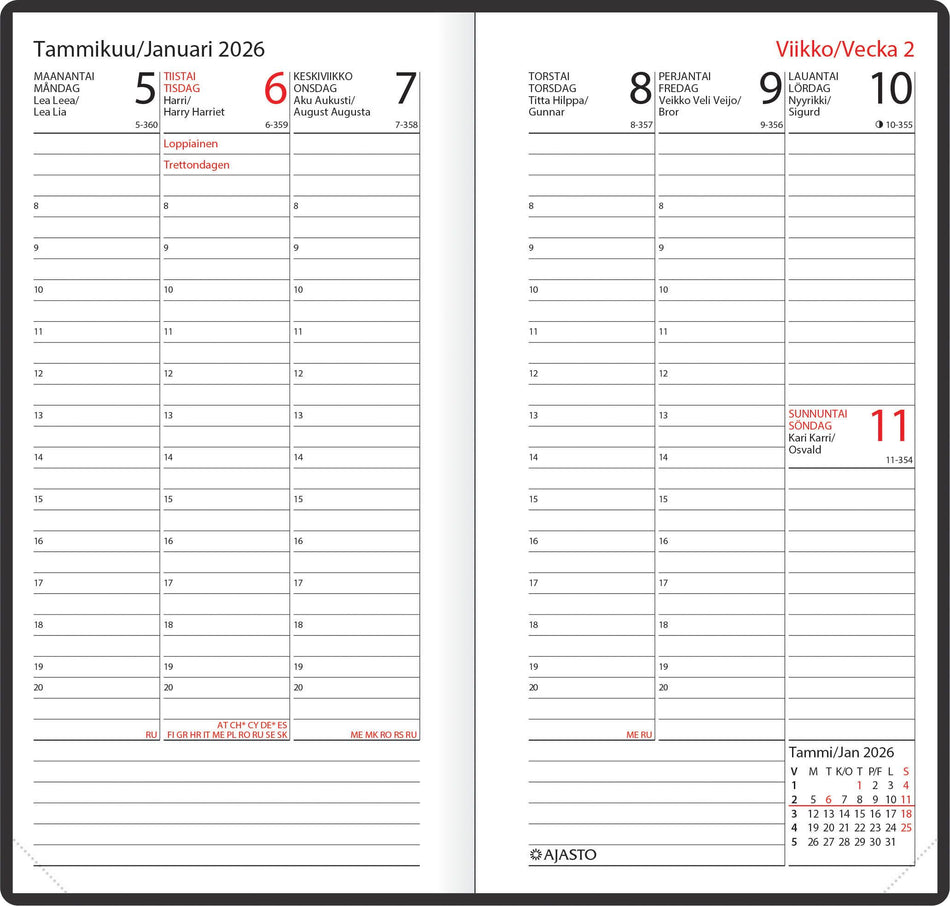 Koko 85 x 162 mm; leatherette-kannet; sidottu; kielisyys: suomi, ruotsi; aukeamalla pystyviikko; päiväkirja 48/2025-1/2027; vuosisuunnitelmat 2026 ja 2027; liputuspäivät Suomessa; kansalliset vapaapäivät; suomalaiset ja suomenruotsalaiset nimipäivät; vuosiruudukko; välimatkataulukko; muistiinpano... Lue lisää