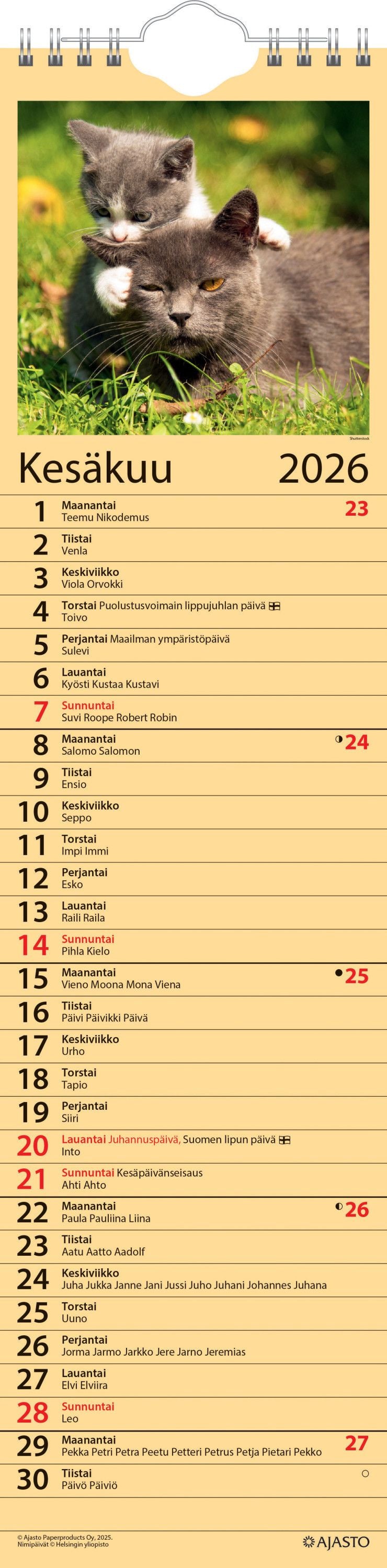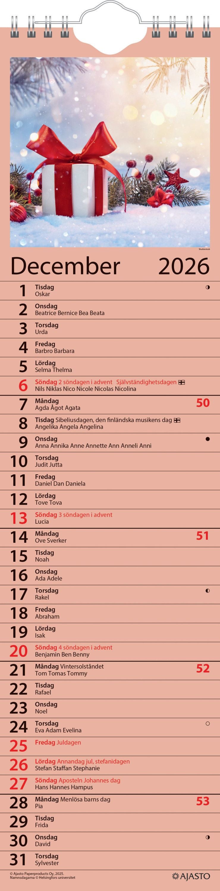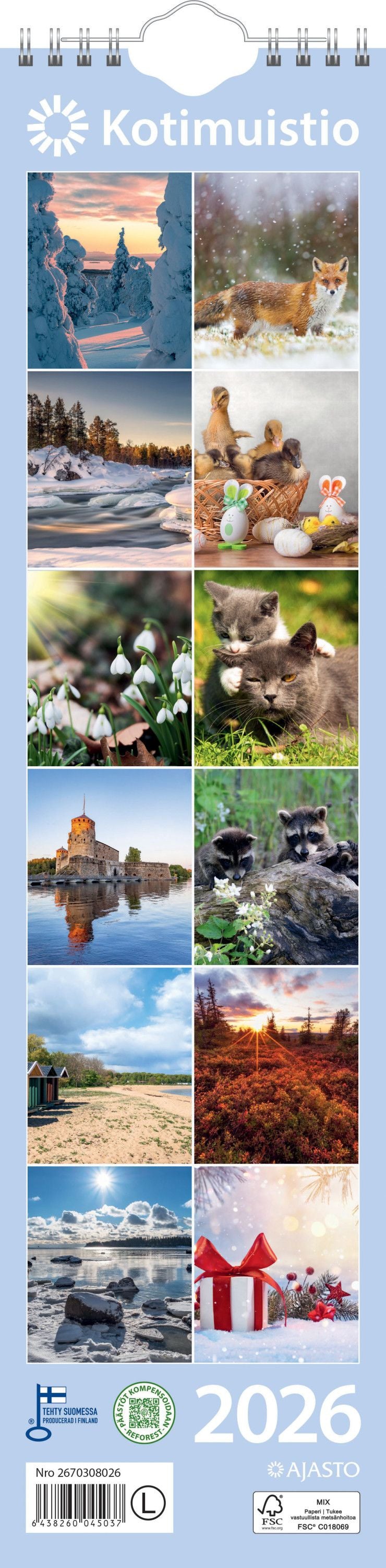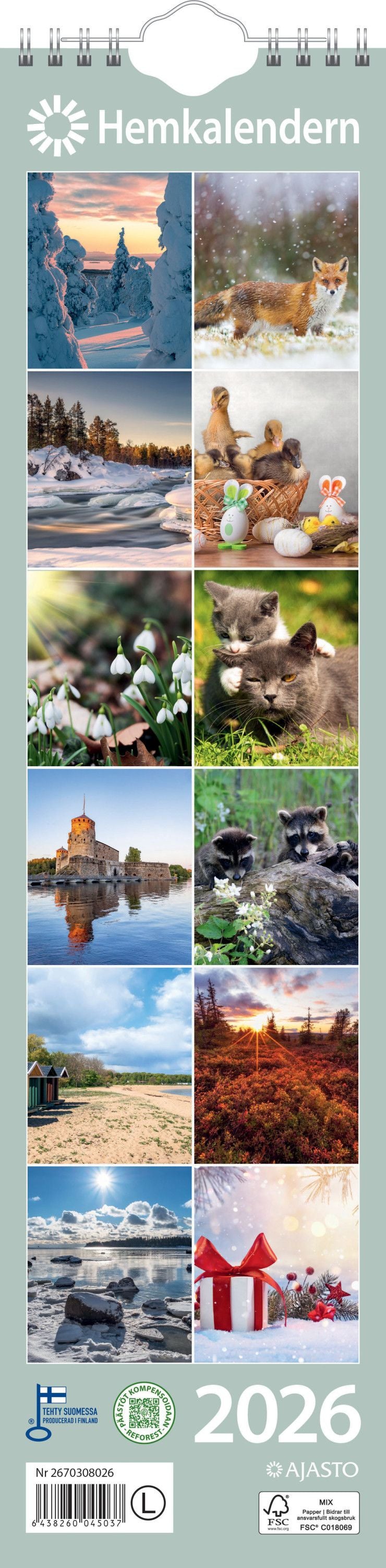 Koko 110 x 432 mm; parikierresidottu; kielisyys: suomi, ruotsi; teemakuva jokaiselle kuukaudelle; toinen puoli suomen- ja toinen ruotsinkielinen; nimi- ja juhlapäivät; Avainlippu-tuote; FSC®-sertifioitu tuote; 100 % hiilineutraali tuote. Lue lisää