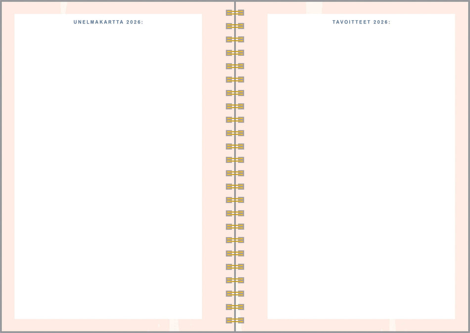 Koko 148 x 210 mm (A5); parikierresidottu; leatherette-kannet; aukeamalla selkeä viikkonäkymä; päiväkirja 1/2026 - 1/2027; liputuspäivät Suomessa; suomalaiset nimipäivät; runsaasti muistiinpanotilaa; joka kuukauden alussa tilaa tärkeille päivämäärille ja tavoitteille; FSC®-sertifioitu tuote. Lue lisää
