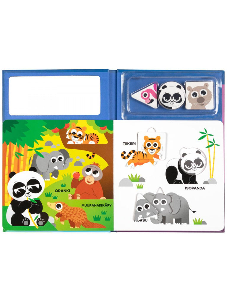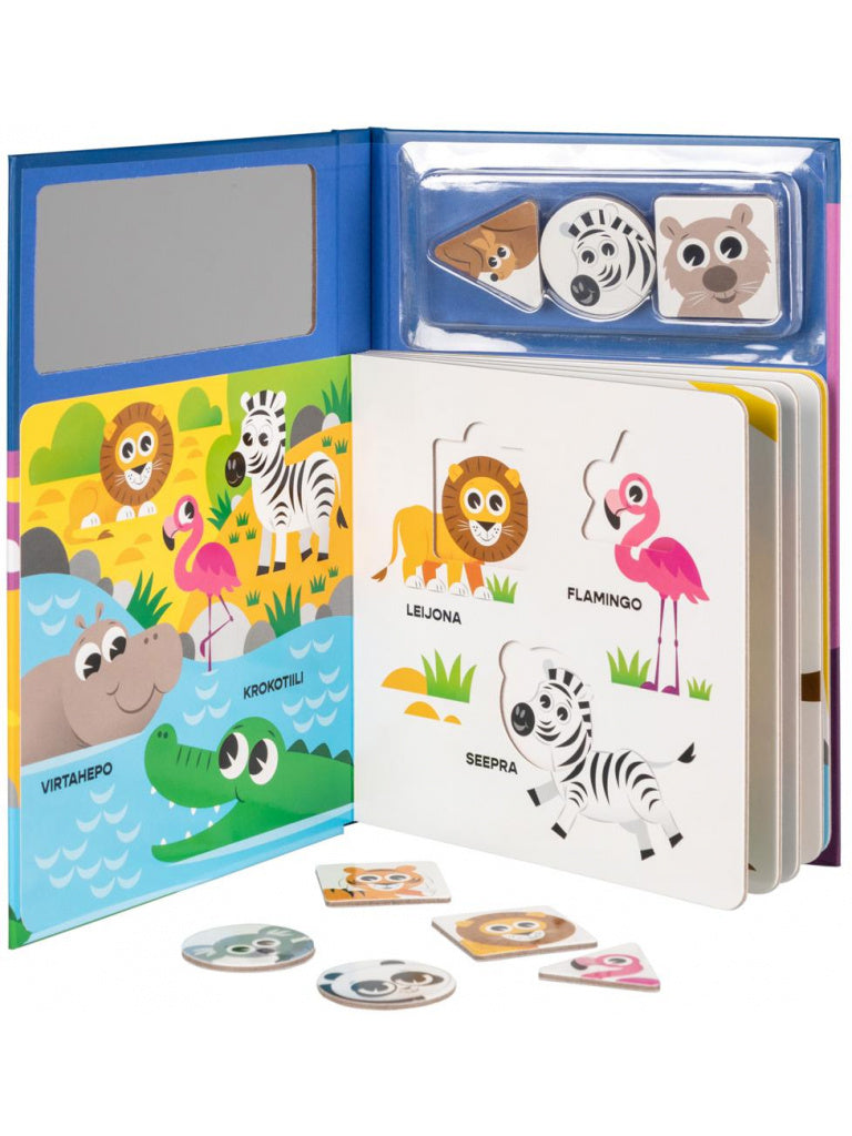 Veikeät eläimet tulevat tutuiksi tässä palapelikirjassa. Katso kuvasta mallia ja aseta erimuotoiset palat oikeille paikoilleen. Kokeile, miten hassuja nassuja syntyy palojen paikkaa vaihtamalla!