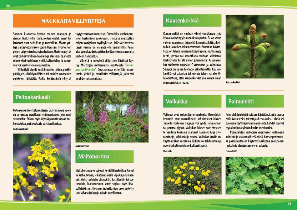 Jokaisessa vuodenaikakirjassa kerrotaan, mitä luonnossa tuolloin tapahtuu. Mitä kasvien ja eläinten elämässä tapahtuu. Kerrotaan myös niistä juhlapäivistä, jotka osuvat kyseiseen ajanjaksoon. Millaisia perinteitä ja perinneruokia liittyy esimerkiksi jouluun. Kirjoissa annetaan valmistusohjeita ruokiin ja herkkuihin, joiden raaka-aineita on tuolloin tarjolla luonnossa tai jotka liittyvät ajanjakson juhlapäiviin.