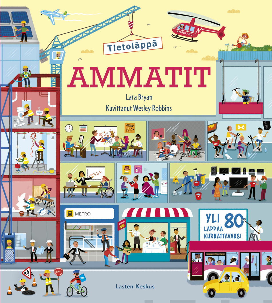 Näyttävän kirjan luukkujen taakse kätkeytyy kiinnostavaa tietoa eri ammateista. Yksityiskohtainen kuvitus, hauskat puhekuplat ja selkeät tekstit marssittavat esiin yli 100 ammattia. Kiirettä pitää, kun eri alojen ammattilaiset huhkivat töissään - sisällä ja ulkona, yhdessä ja yksin, ylhäällä ja alhaalla, jopa maan alla!