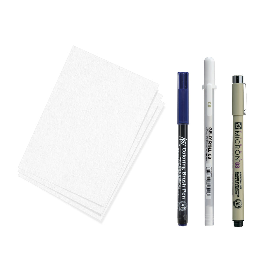 Luo taideteos vain kolmella kynällä! QR-koodilla ilmainen tutorial -opetusvideo! Tässä luovassa pakkauksessa saat Sakuran Pigma Micron kynän, Gelly roll geelikynän ja Koi sivellinkynän sekä 3 mixed media A6-paperiarkkia. Lue lisää