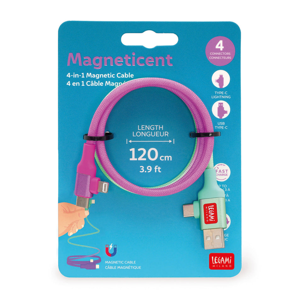 Magneettinen 4-in-1 lataus- ja synkronointikaapeli Magneticent - Electric Aura. Neljä liitintä: USB ja tyyppi-C, tyyppi-C ja lightning. Magneettinen johto rullautuu siististi kasaan itsestään. Tukee pikalautausta PD-teknologialla. Tukee tiedonsynkronointia.
