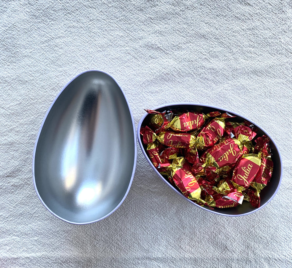 Kaunis avattava metallinen koristemuna. Koko 12 cm. Sisään voidaan laittaa vaikka karamelleja (mahtuu n. 160 g käärekarkkeja). Lue lisää