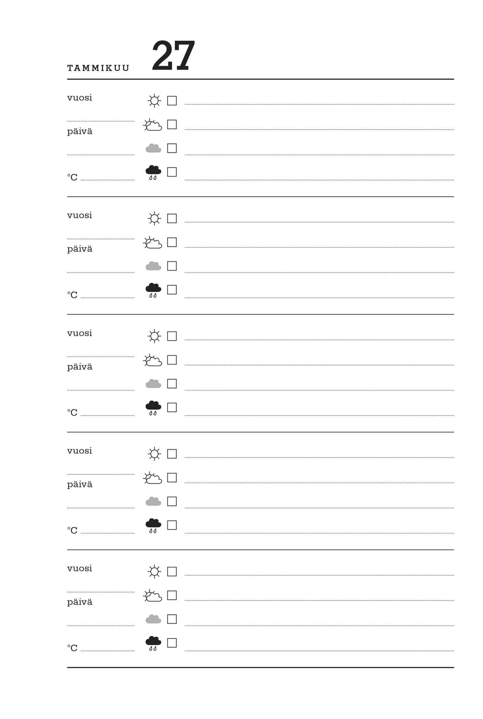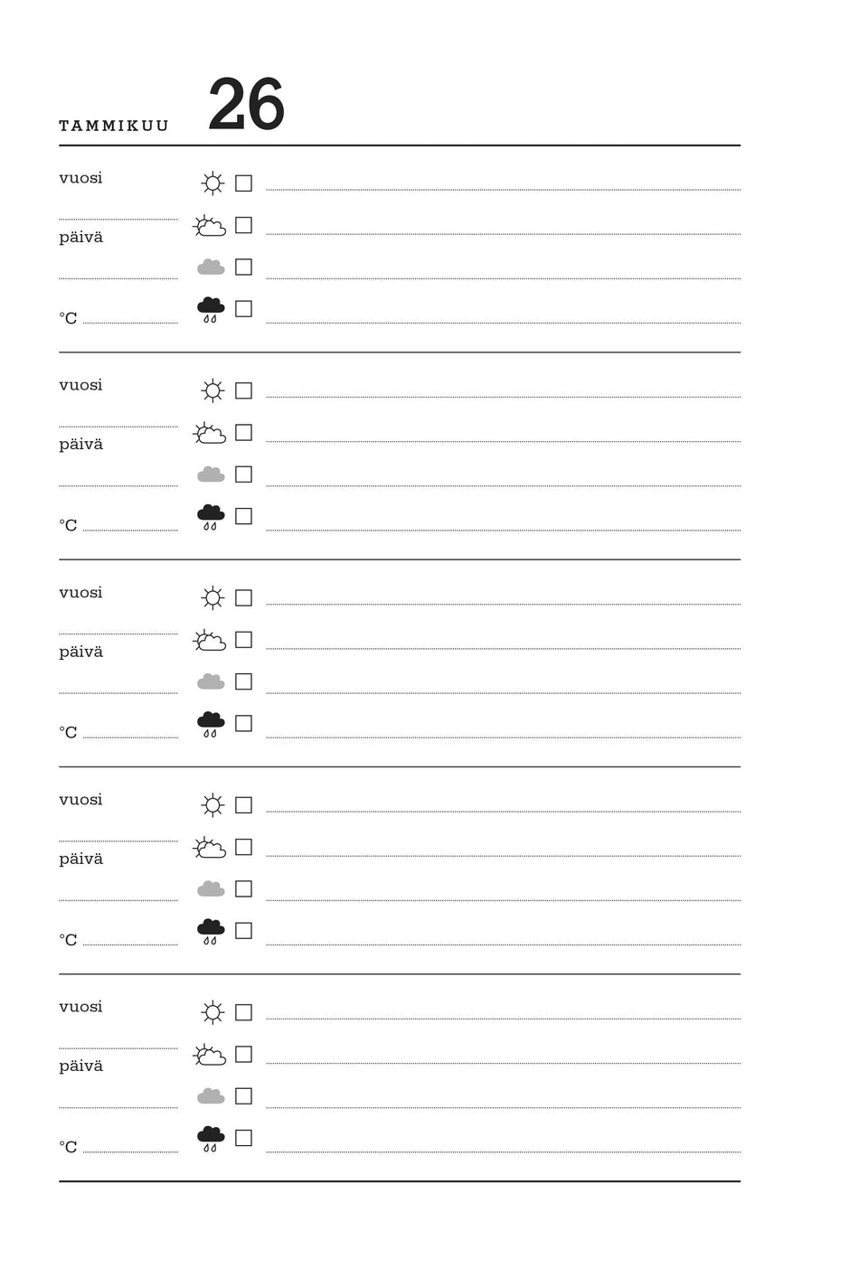 Viiden vuoden päiväkirjaan kokoat kätevästi niin tärkeät tapahtumat, säätiedot kuin muutkin havainnot. Päiväkirjassa on yksi sivu jokaiselle vuoden päivälle. Tyylikäs päiväkirja on 100 % kotimaista tuotantoa.