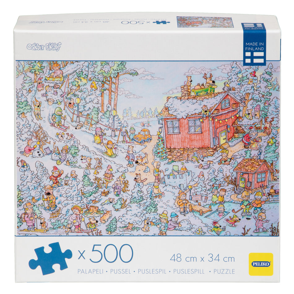 Suomalaisen kuvittajan Oskar Eklöfin piirtämä yksityiskohtia ja hassuja hahmoja pursuileva talvinen kuva. Valmiin 500 palan palapelin koko on 48 x 34 cm. Pelikon palapelit valmistetaan Suomessa kierrätyskartongista, aurinkoenergian voimalla tuotetulla sähköllä. Lue lisää