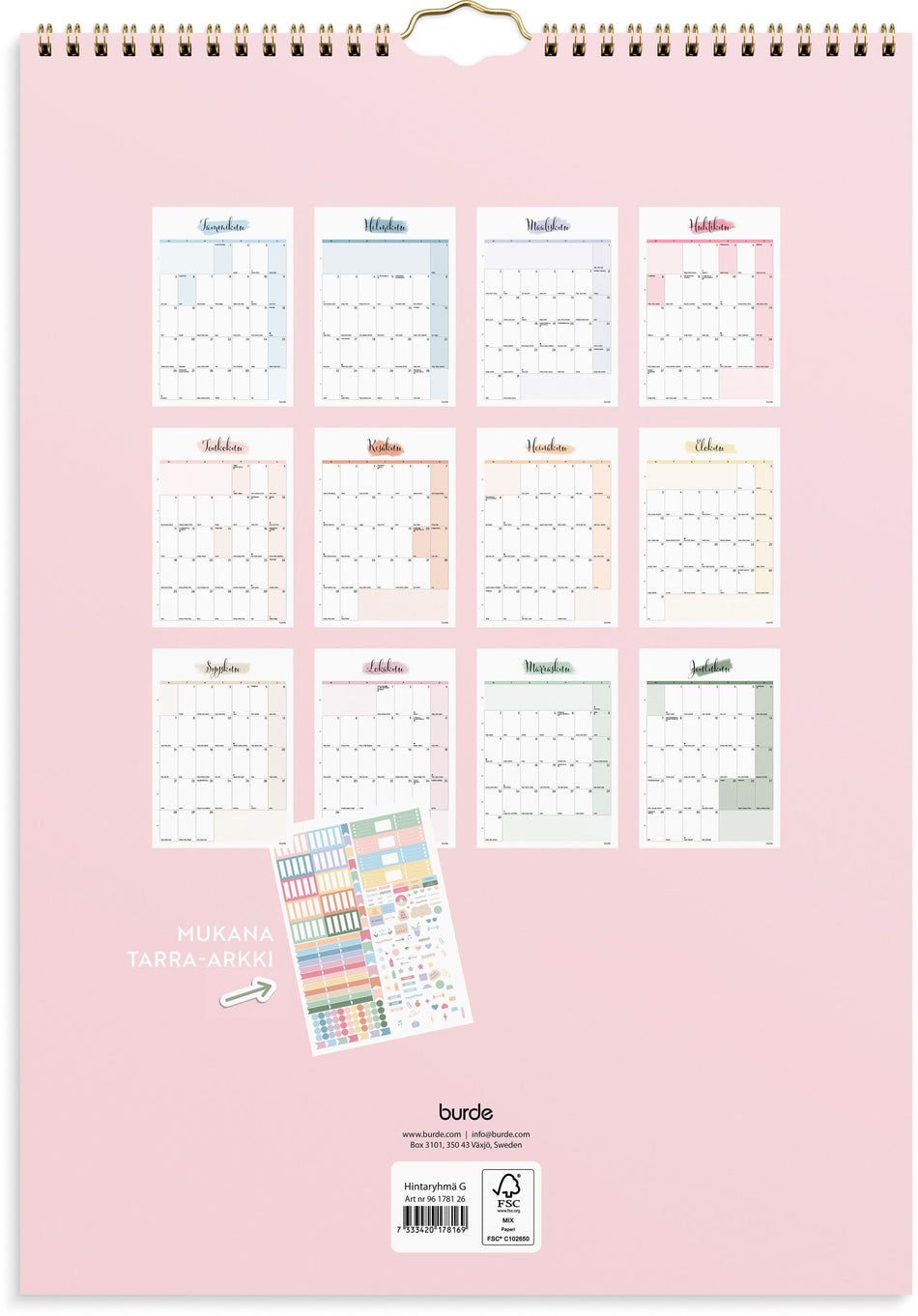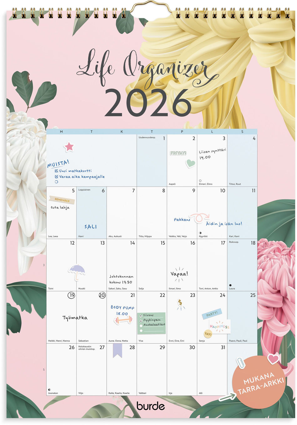 Iso ja selkeä seinäkalenteri, johon mahtuu paljon merkintöjä päivälle. Lisäksi mukaan tulee paljon tarroja, joilla saat koristeltua ja suunniteltua menosi hauskasti!