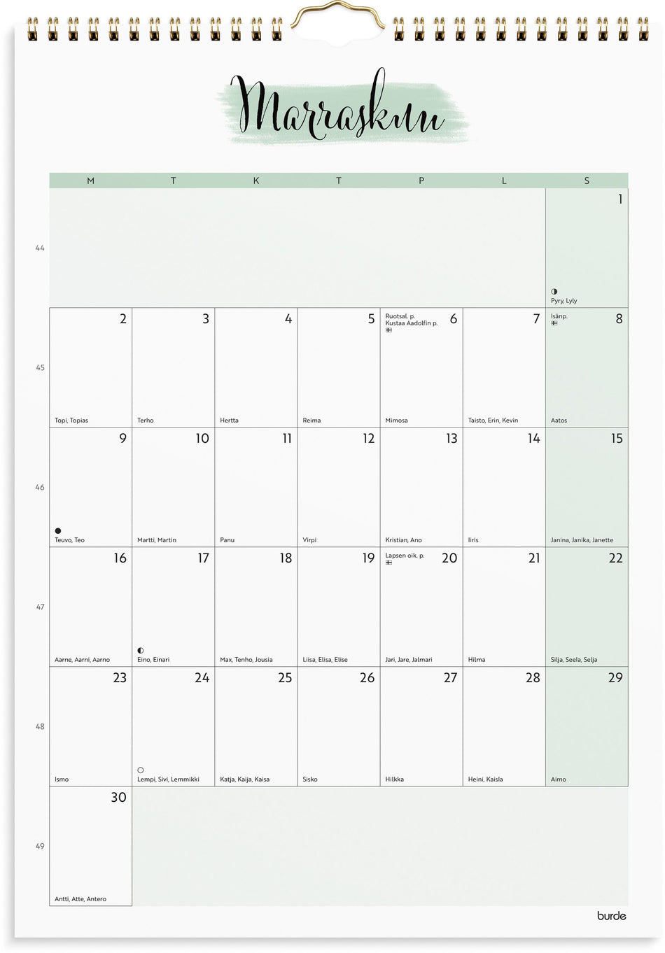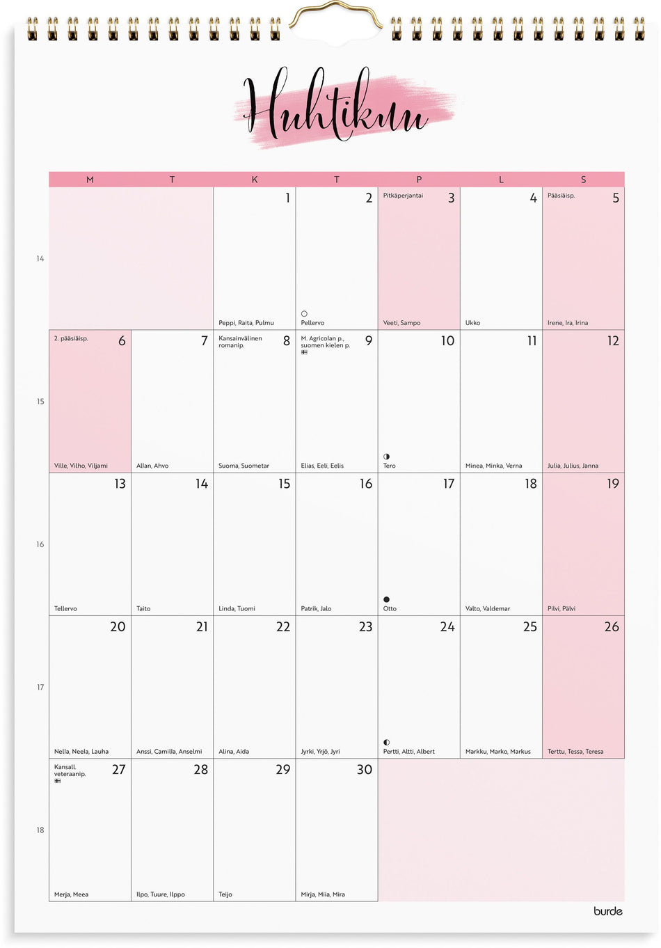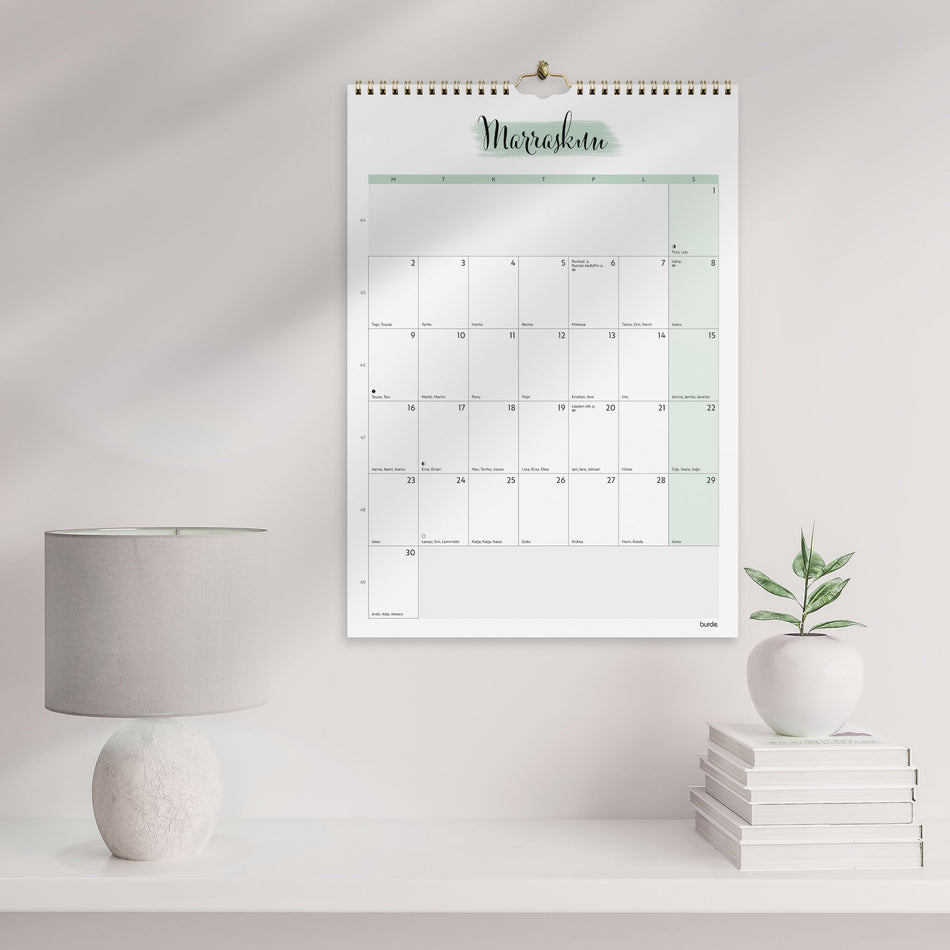 A3-kokoinen seinäkalenteri, jossa on paljon tilaa arjen organisointiin. Muodikkaan ulkoasun ja tyylikkäiden pastellivärien ansiosta kalenterille löytyy helposti paikka. Koristele kalenterisi mukana tulevilla tarroilla. Näin tuot suunnitteluun persoonallisuutta! Kalenteri sisältää nimipäivät, lipu... Lue lisää
