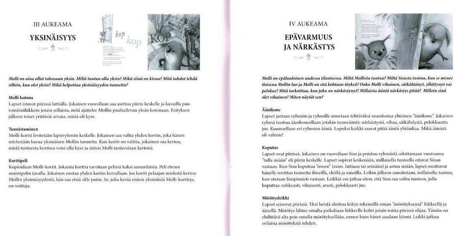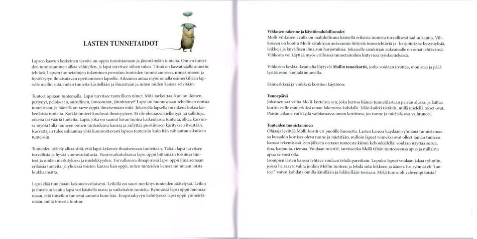 Kirjanen sisältää erilaisia tehtäviä ja toimintaa - sekä kehollisia että kuvallisia, sekä yksin että ryhmässä toteutettavia. Innostavan materiaalin avulla voidaan lapsiryhmässä harjoitella erilaisia tunnetaitoja sekä omien tunteiden tunnistamista ja nimeämistä. Tehtävät perustuvat Katri Kirkkopellon kuvakirjaan Molli (Lasten Keskus 2013).