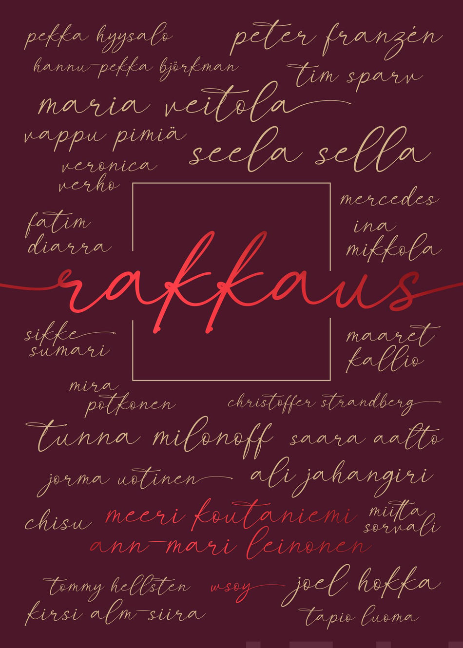 Tässä kirjassa 25 tunnettua suomalaista kertoo, mitä rakkaus eri puolineen heille merkitsee. Kirjan ovat kirjoittaneet Meeri Koutaniemi ja Ann-Mari Leinonen. Lisäksi Koutaniemen muotokuvat luovat visuaalisen ikkunan kirjaan haasteltujen ihmisten persoonaan ja heidän tarinansa viipyilevään ja avoimeen inhimillisyyteen.