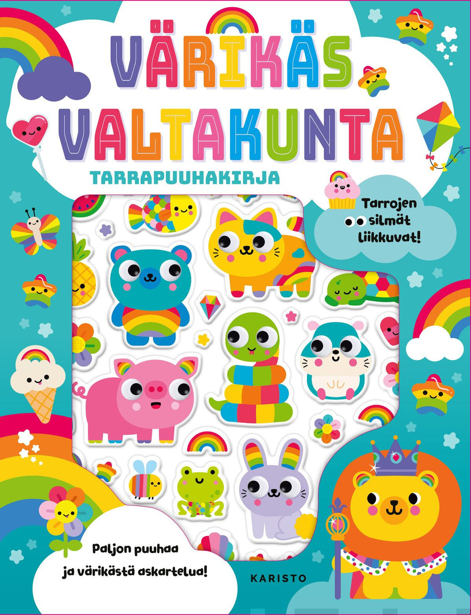Iloisen värikäs tarrapuuhakirja, jonka tarrojen silmät liikkuvat.