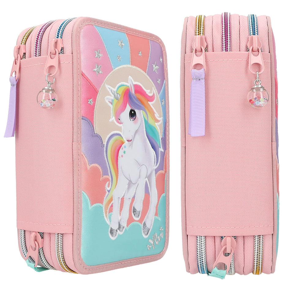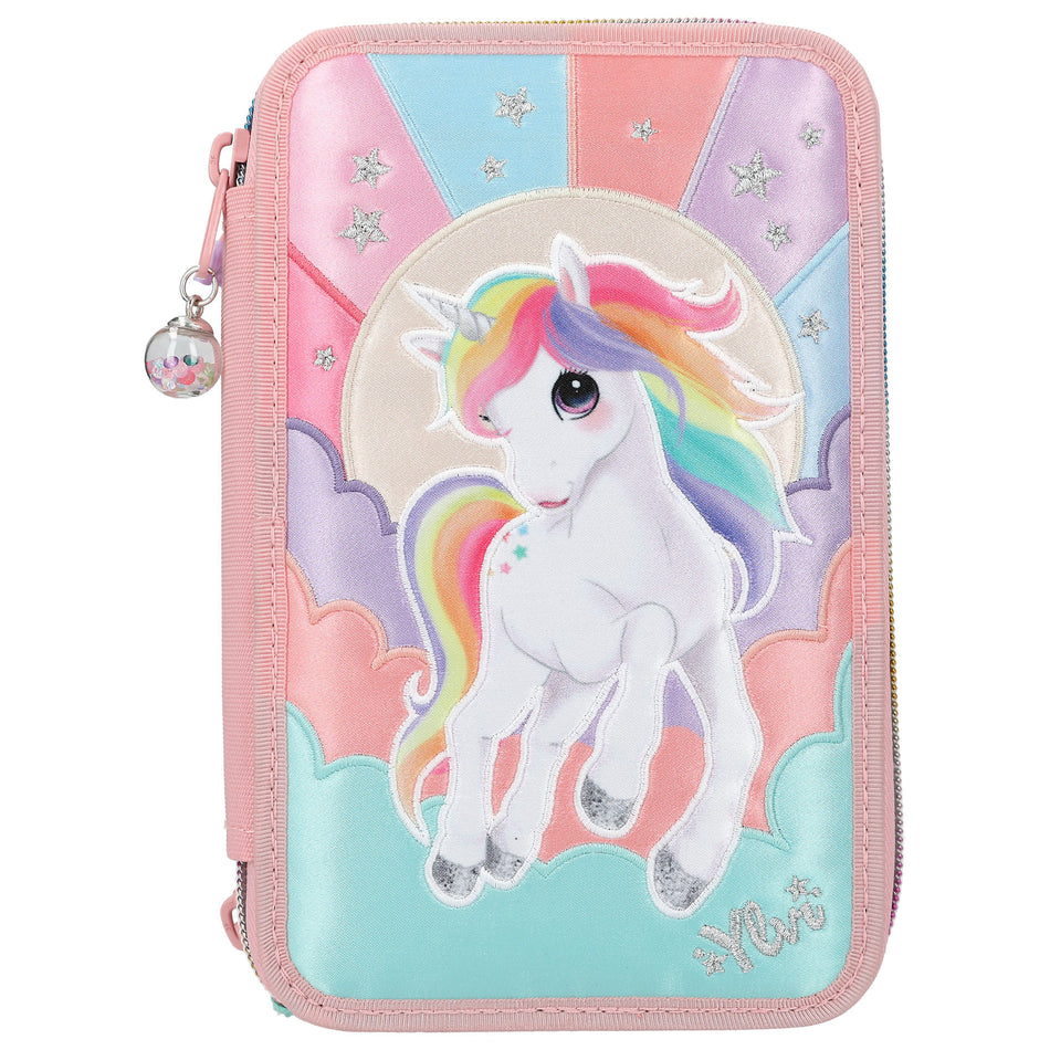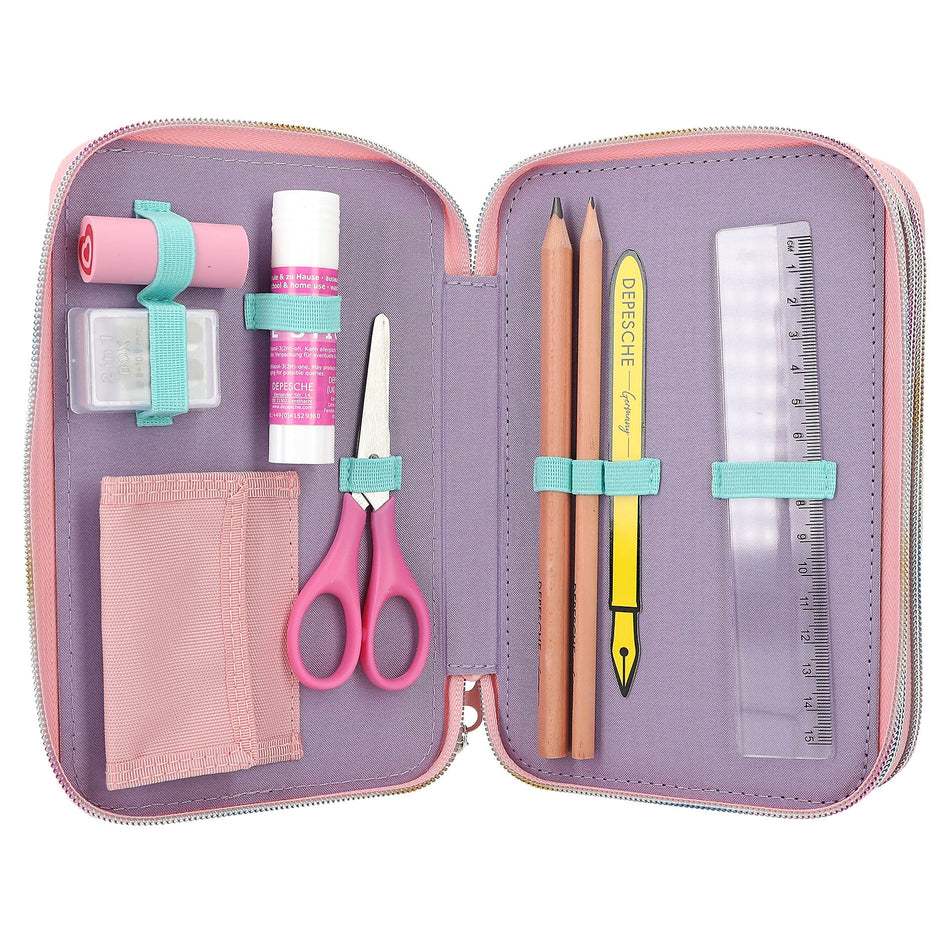 Ylvi-penaalissa on kolme vetoketjuin suljettavaa kerrosta ja se on täynnä kirjoitustarvikeita. Lue lisää