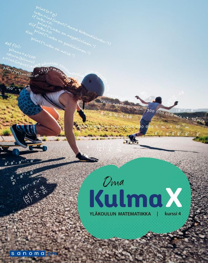 Kulma X Oma kirja 4 innostaa oppimaan ja harjoittelemaan matematiikkaa erilaisista kulmista. Kirja sisältää Kulma X -oppikirjaa vastaavan kurssin 4 Potenssi, neliöjuuri ja ohjelmointia.