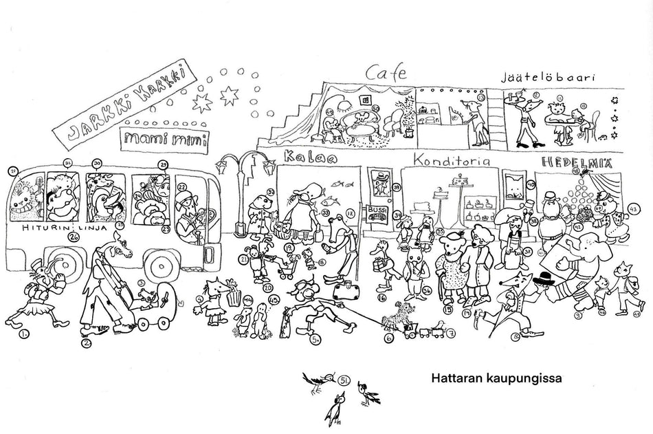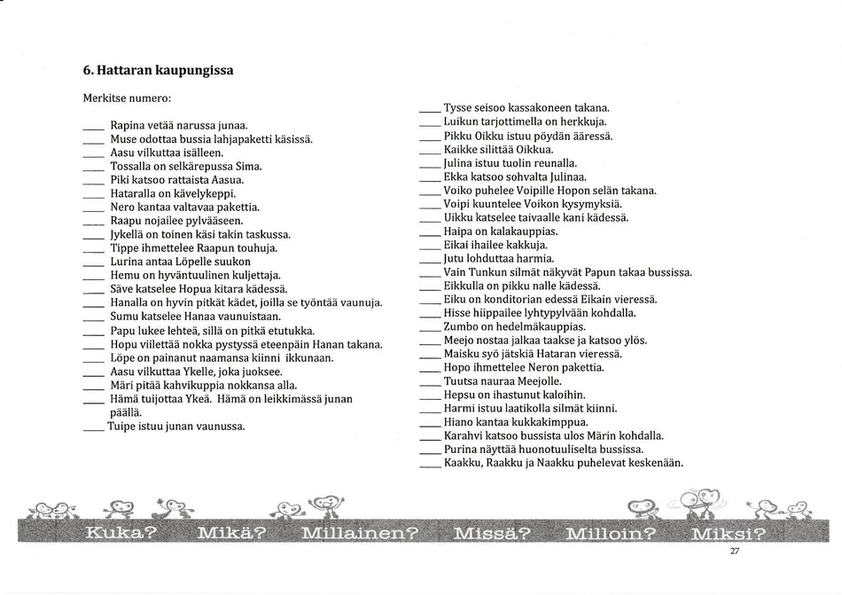 Kirjassa on nimikartat jokaisen kuvasivun hahmojen nimistä sekä 7 sivua lisätehtäviä ja tarkistussivu.
