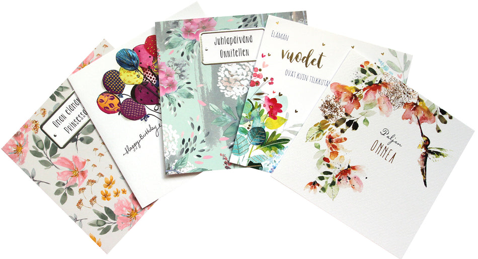 Tekstitön 2-osainen onnittelukortti, lajitelmassa 5 kappaletta eri kuva-aiheista korttia. Kauniit avattavat onnittelukortit syntymäpäiväksi ja muihin juhlapäiviin. Lue lisää