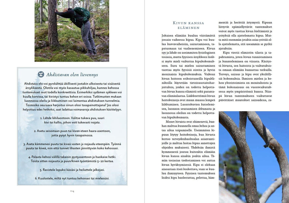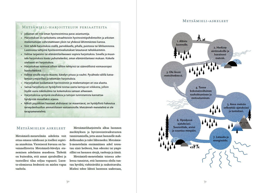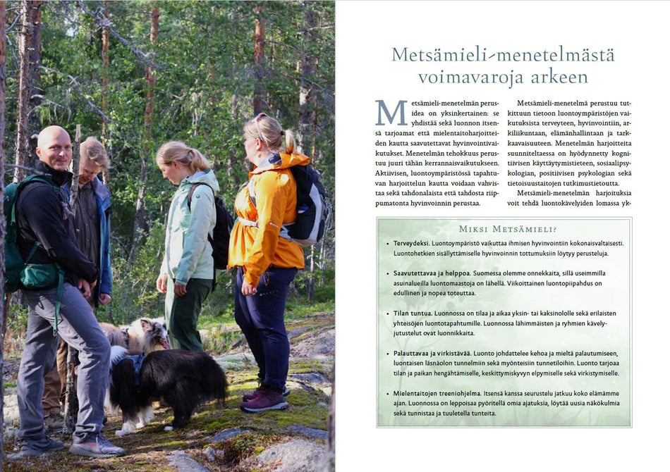 Metsämieli-menetelmän perusteos opastaa konkreettisiin tapoihin hyödyntää luonnon hyvinvointi- ja terveysvaikutuksia oman elämänvoiman vaalimiseksi. Kirjassa on yli 80 harjoitusta yksin ja yhdessä toteutettavaksi omassa lähiluonnossa.
