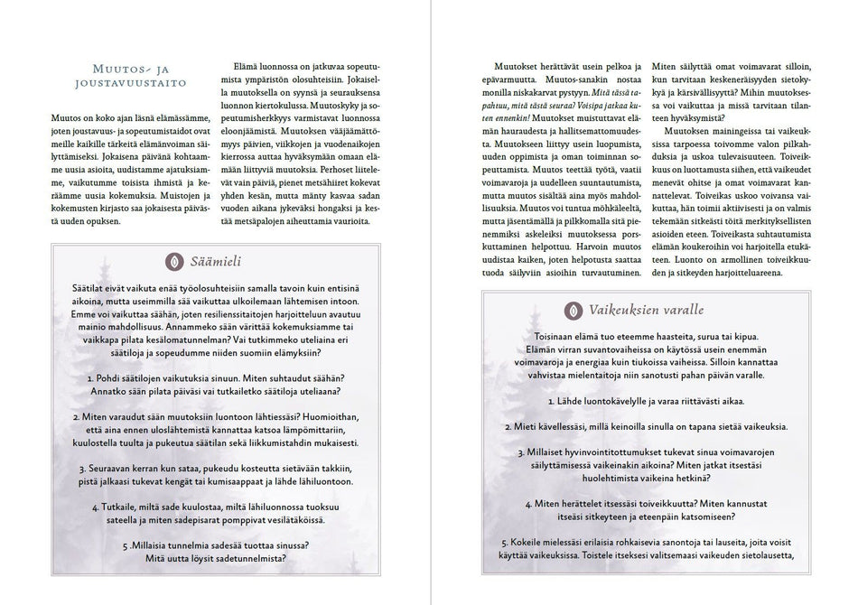 • Avainsanat elämänhallinta; hyvinvointi; luontosuhde; mielikuvaharjoittelu; resilienssi; lähiluonto; psyykkinen hyvinvointi; elinvoima; metsämieli; luonnon terveysvaikutukset