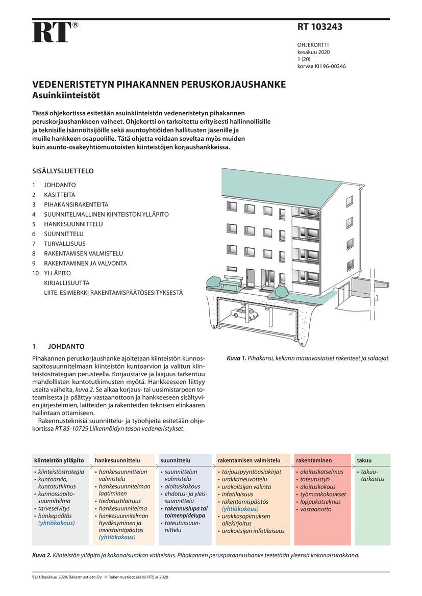 Ohjekortissa esitetään asuinkiinteistön vedeneristetyn pihakannen peruskorjaushankkeen vaiheet. Ohjekortti on tarkoitettu erityisesti hallinnollisille ja teknisille isännöitsijöille sekä asuntoyhtiöiden hallitusten jäsenille ja muille hankkeen osapuolille. Tätä ohjetta voidaan soveltaa myös muide... Lue lisää