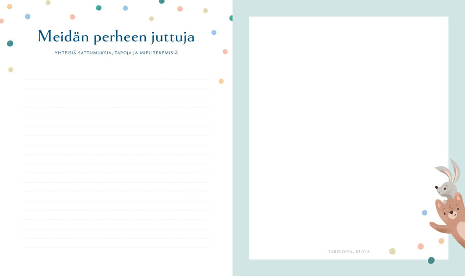 - Thema-luokitus Vanhemmuus; Lastenhoito ja kasvatus; Lahjakirjat; Teemapäiväkirjat ja -muistikirjat; Lasten lahjakirjat