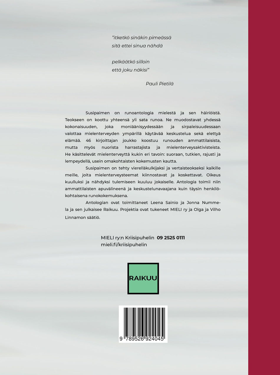 Antologian ovat toimittaneet runoilijat Leena Sainio ja Jonna Nummela. Jokaisesta myydystä teoksesta lahjoitetaan 1 euro Mieli ry:n Kriisipuhelimessa vastaavien vapaaehtoisten koulutustyöhön. Susipaimenen julkaisee Kustannus Raikuu.