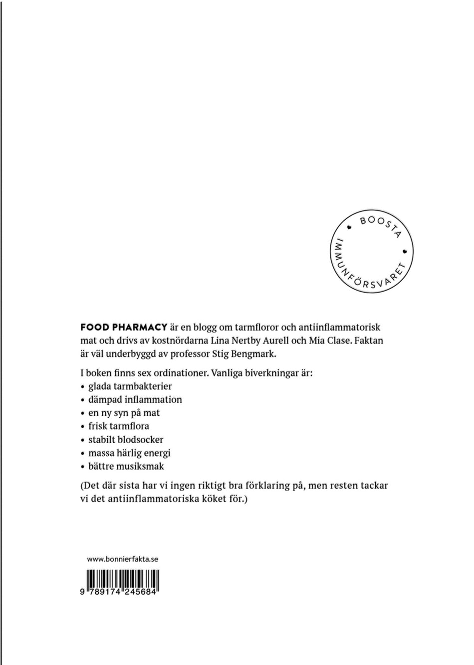 Förra årets succébok Food Pharmacy lärde oss allt om antiinflammatorisk mat, bakterier, hjältar i köket, antioxidanter och vetenskapliga studier (och så var det något om Star Wars också).Här är kokboken som förenklar din vardag. Här vänder sig Lina och Mia till alla som vill börja jaga näring och äta mat som gör tarmfloran gott och håller inflammationen (och många sjukdomar) borta.Recepten innehåller mängder med grönsaker, en del nötter och kryddor för smak och antiinflammatorisk boost, tillagade på ett så skonsamt sätt som möjligt för att bevara så mycket näring som möjligt. Rätterna är gluten-, mjölk- och sockerfria och noga provlagade för att smaka riktigt gott.Här finns måltider för alla tillfällen: snabba vardagsrätter, lyxigare fine dining-rätter och närande smoothies. Vad sägs om recept på den optimala middagssmoothien, idévärldens lasagne och världens godaste brownie?Det här är ingen diet utan hälsosam mat för alla. Och den bygger på exakt de råd alla experter faktiskt är överens om – ät mycket grönsaker och skippa sockret!Lina Nertby Aurell och Mia Clase driver den välbesökta och omtyckta hälsobloggen och podden Food Pharmacy. År 2016 utkom den omåttligt populära boken med samma namn.