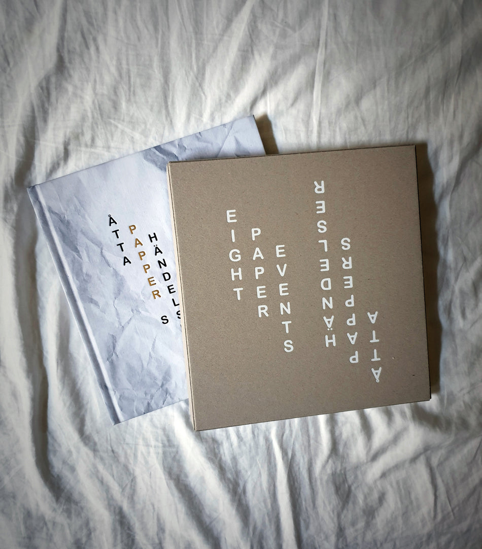 Åtta Pappershändelser är en artists´bok där materialet är producerat primärt för att visas i bokform. Boken består av åtta olika delar som alla på olika sätt gestaltar skeenden som utgår från papperets ontologi eller vara. Här kan man se visuella vackra excesser i den inledande fotografiska serien möta dokumentationen av partituret On Paper – där det akustiska av just papper gestaltas. Här kan man i en del av boken se performanceverk från Paris floder avlösas av ett dissekerande av Sartres Varat och Intet i en annan del. Det experimenteras också med olika papperskvaliteter där utvik och statements bäddas in i försätts och eftersättsbladet.