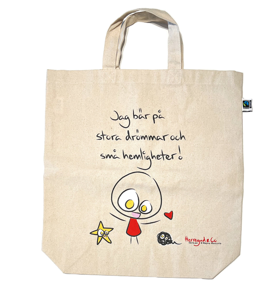 Jag bär på stora drömmar och små hemligheter! Att använda en tygkasse från Herregud & Co istället för en plastpåse glädjer både dig, andra och omgivningen runt omkring. Kassen är i Fairtrade-märkt bomull (220 g/m2) med ett transfertryck 20x20 cm på en sida. Handtvätt rekommenderas. Herregud & Co har hundratusentals följare på Instagram och Facebook. Bakom de tänkvärda och underfundiga ögonblicksbilderna finns illustratören och kommunikatören Royne Mercurio. Han vill genom sina bilder påminna om att världen går att göra lite vackrare och lite varmare.