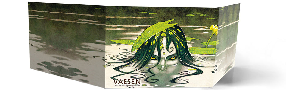En lyxig spelledarskärm till rollspelet Nordiska väsen i praktiskt landskapsformat. Utsidan visar en stor illustration av Johan Egerkrans och insidan innehåller tabeller och information som underlättar spelet. Lue lisää