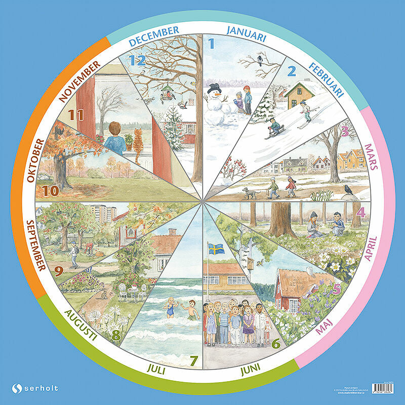 En stor och tydlig plansch med månadernas namn, siffra och representativa bilder. Årstiderna är färgkodade. Perfekt att sätta på väggen i förskolan eller klassrummet!
