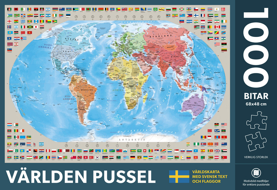 Världen Pussel 1000 bitar är ett roligt sätt att umgås med familjen och samtidigt lära mer om världens geografi. Pusslet har en politisk kartbild där kontinenterna presenteras i olika färger och angränsande länder visas i skiftande nyanser. Hav, länder och ett urval städer är markerade och runt om kartan finns respektive lands flagga. Pusslets storlek 68x48cm, lådan är 33x23x3,7cm, poster med pusselmotiv medföljer, svensk text.