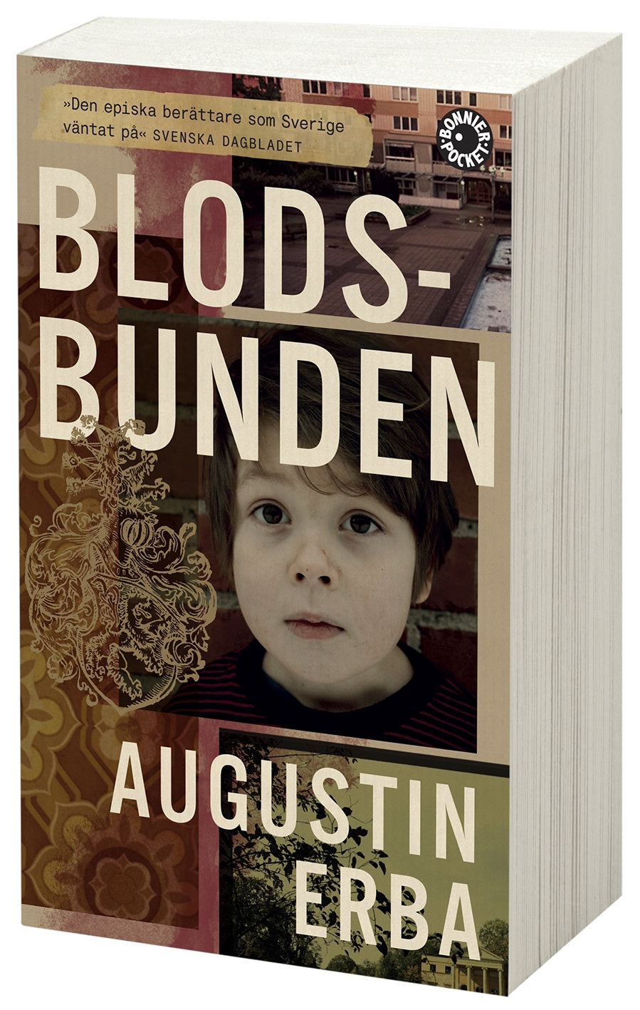 Mitt i en nedgången förort bor en blåblodig prinsessa med sin man, deras tre barn och en gigantisk schäfer. Innanför väggarna i höghuslägenheten försöker familjen hålla en egen värld vid liv, och där vill mamman helst stanna. Den äldste sonen Amadeus sätts i privatskola i stan "för att inte bli knarkare som grannbarnen", som hans mamma säger. Han ska bli bäst i skolan, säger hans våldsamma pappa, som är besatt av tanken att barnen ska klara sig bättre i Sverige än han själv gör.I förorten är Amadeus den snobbige pojken som inte hör hemma och bland överklassbarnen i privatskolan passar han inte heller in utan mobbas hänsynslöst och brutalt.Så småningom möter vi den vuxne Amadeus, som tror att han gjort sig fri från blodsbandens krav. Han har gift sig med kloka och starka Petra, han har bildat en ny, mer harmonisk familj. Men allt han har vunnit sätts på spel när hans bästa vän ber honom hjälpa henne och hennes tjej att skaffa barn. Varken Amadeus nya familj eller hans gamla ser med blida ögon på detta hot mot kärnfamiljen.Blodsbunden är en historia om att aldrig förlora hoppet om en bättre värld. Med stor närvaro och svart humor tar sig Augustin Erba frågor om arv, familj och frihet. Denna gripande berättelse tar avstamp i hans eget liv och de läsare som berörts av hans texter i antologierna Mor, mamma, morsan och Uppdrag pappa kommer att sträckläsa den här romanen.