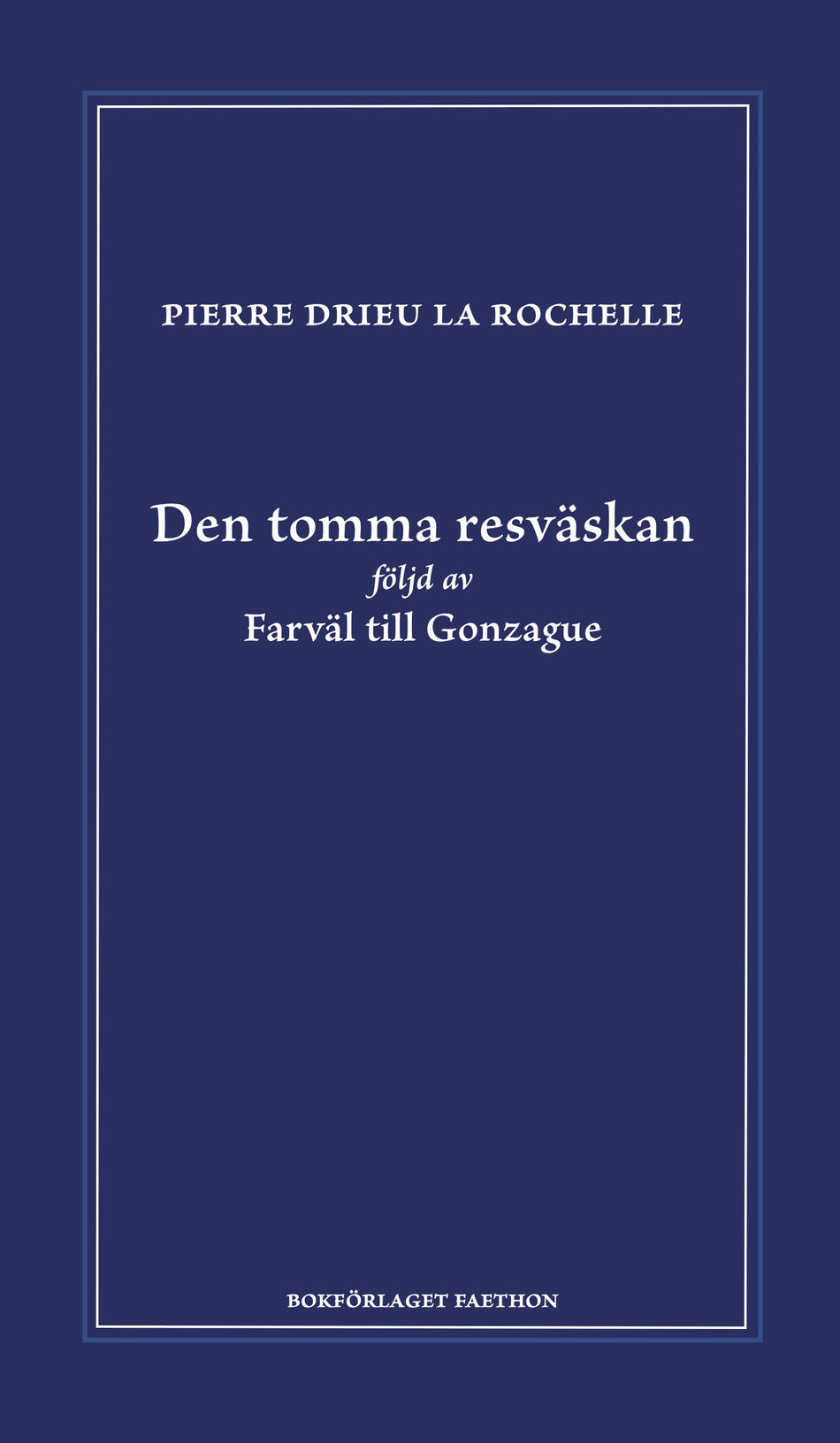»Jag tänkte att jag faktiskt inte tyckte att Gonzague var särskilt kvick eller lustig. Men ett slags högmod kom till min undsättning, jag ville rättfärdiga min vana och Gonzague drog fördel av det. Bland andra var hans gestalt ganska roande. Jag krävde inte mycket av honom. Vi talade om våra slipsar, om nästa boxningsmatch och våra kamraters framtid. Kanske den här kommer att inträda i Akademien? Naturligtvis. Och den här kanske blir statssekreterare? Varför inte. Den här tredje kommer att lämna sin egen värld och snart ligga i en arvtagerskas säng och sitta i fyrtio olika bolagsstyrelser. Vi pratade på. Gonzague hängav sig åt vår lilla lek med sin primitiva observationsförmåga som inte utvecklades i brist på eftertanke och meditation. Han låtsades känna igen sig bland indolensens, skyndsamhetens, skörlevnadens och enkelhetens skenbilder. Men i sin avsaknad av all känsla för det tragiska förnam han inte de hemliga tonfallen i en röst som ljöd bakom en mask.« Pierre Drieu la Rochelle  Pierre Drieu la Rochelle (18931945) var en fransk författare. Han rönte framgångar med en rad romaner om Paris borgerliga liv. Irrblosset (1931) utgör tillsammans med den postumt utkomna Farväl till Gonzague och Den tomma resväskan hans »cycle Rigaut«, som baseras på hans vän Jacques Rigaut, som tog sitt liv 1929. Den tomma resväskan och Farväl till Gonzague har här för första gången översatts till svenska. Hillevi Norburg översatt och Daniel Pedersen har skrivit ett efterord.