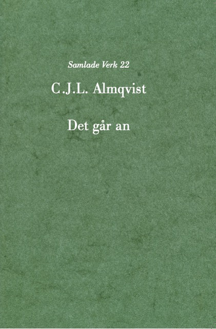 När C.J.L. Almqvists roman Det går an gavs ut i december 1839, följde en av den svenska litteraturens stora fejder. Med sitt budskap om frihet och självständighet för kvinnor, ekonomiskt och erotiskt, utmanade berättelsen samhällets eliter. Under våren 1840 och framöver kom en rad följdskrifter, böcker där romanens budskap diskuterades och där Almqvists motståndare diktade vidare på berättelsen för att visa hur fel Sara och Albert resonerar när de beslutar att leva samman utan att vara lagvigda. Men för eftervärlden har bilden av romanen långsamt ändrats; dess liberala frihetslära verkar förutseende snarare än samhällsupplösande, dess vardagsrealism charmerande snarare än chockerande. 1838 års version har tidigare utgivits inom Almqvists Samlade Verk, men det var alltså versionen från 1839, d.v.s. den som nu utges, som gav upphov till alla debatter om bokens innehåll. Nu utges 1839 års version för första gången i en vetenskaplig utgåva, redigerad och kommenterad av Johan Svedjedal.
