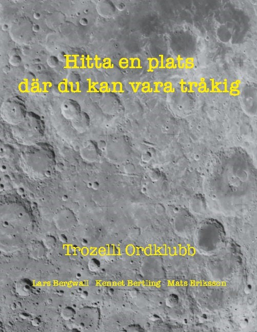 Ett ord. En A4 sida. En månad. Det är utgångspunkt och ram för bokens texter. I mars 2016 bildades Trozelli Ordklubb. Drivna av en lust att skriva och en vilja att utforska språkets möjligheter har vi, Lars Bergwall, Mats Eriksson och Kennet Bertling, sedan dess träffats en gång i månaden. Vi turas om att välja ett ord som ska inspirera och den enda regeln är att texterna inte får vara längre än en A4 sida. Nu efter fem år har vi tillsammans skrivit 180 texter utifrån 60 ord. I den här samlingen har vi valt ut 22 ord och 66 berättelser. Att enbart publicera guldkorn var aldrig vår ambition och var heller inte möjligt. Läsaren får alltså ta del av tre försök att skriva utifrån ord som ibland valts av slumpen men vid andra tillfällen finstämt sållats fram ur svenska språkets ljus och mörker. Ibland har alla varit nöjda med texterna vi tagit med oss, ibland har någon upplevt sig hittat guld medan någon tvingats släpa med sig en text med betydligt mattare skimmer. Texterna i Hitta en plats där du kan vara tråkig visar prov på denna variation i lyster.