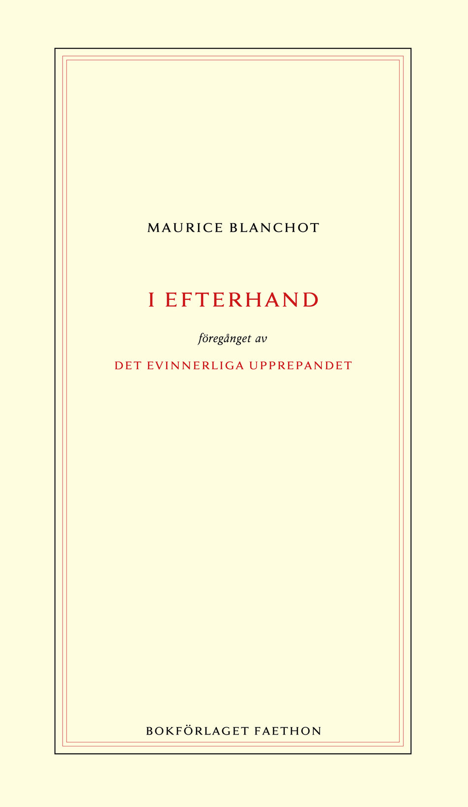 Maurice Blanchots »I efterhand« (1983) kommenterar några texter i ljuset av Auschwitz. Den föregås av »Det evinnerliga upprepandet« som består av berättelserna »Idyllen« (1935) och »Det sista ordet« (1936). Lue lisää