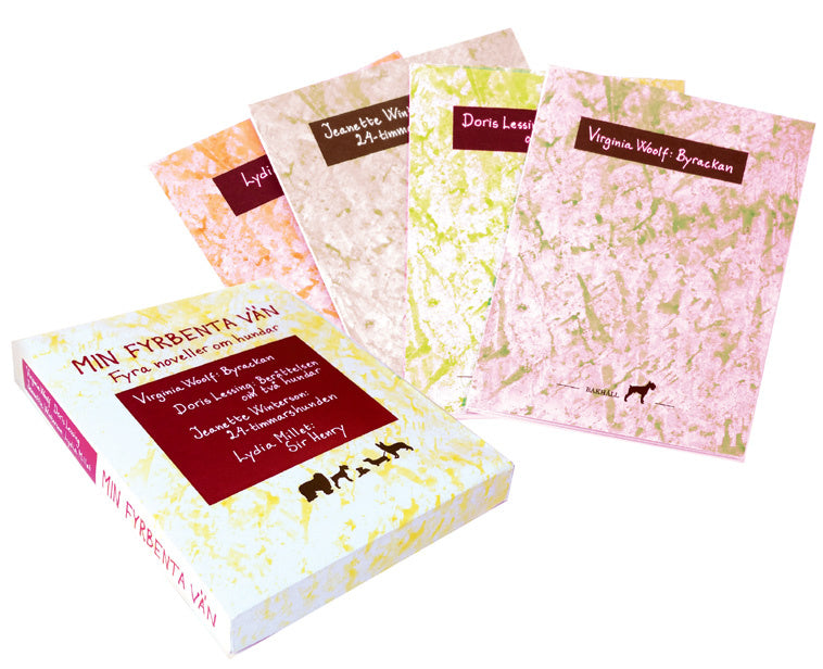 Min fyrbenta vän. Ask med fyra hundnoveller författade av Virginia Woolf, Doris Lessing, Jeanette Winterson och Lydia Millet. ISBN 978 91 7742 515 1. Högkvalitetspapper, sydda ark, mjuka pärmar. Fyra små böcker i en ask, mjuka pärmar, 24, 48, 24 och 24 sidor. Översättning av Andreas Vesterlund.